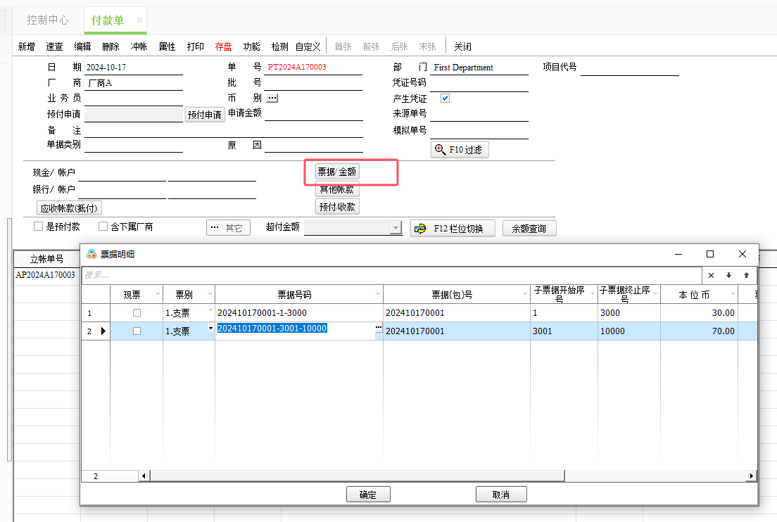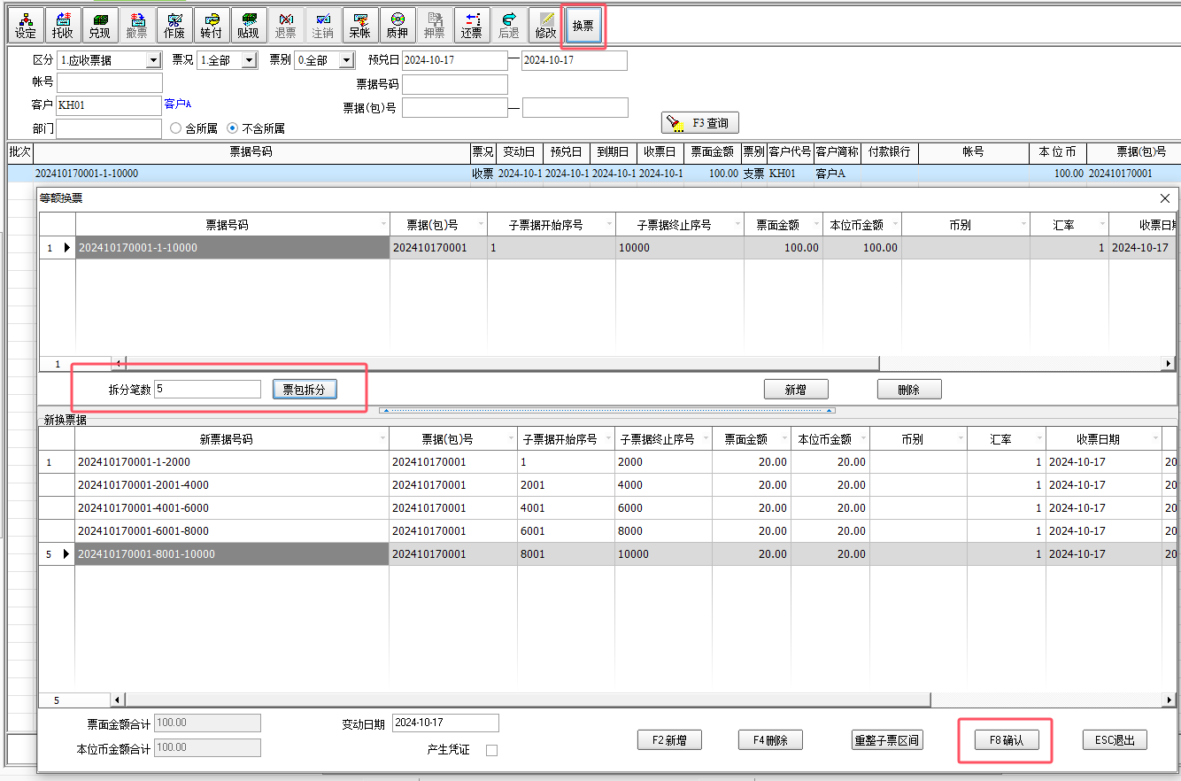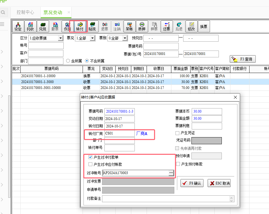 一、要點介紹在現代企業中,業務場景往往復雜多變,一筆交易可能涉及多個部門、多個環節,產生多種類型的票據。票據拆分功能能夠將復雜的交易信息拆分成多個清晰、獨立的票據,使得財務人員能夠更高效地處理財務數據,減少人工干預和錯誤率。便于企業根據實際需求進行精細化管理。這有助于企業更好地適應市場變化,提高業務處理的靈活性和響應速度。 二、新功能亮點☆ 應收票據及應付票據增加可編輯欄位:票據(包)號、子票區間。 ☆ 子票區間與票面金額互推,方便錄入。 ☆ 票據異動作業增加換票功能 ☆ 支持票據回退 ☆ 收付款票據錄入筆數開放沒有限制 三、功能說明3.1、票據的錄入 程序支持直接錄入票據數據,可在應收票據和應付票據中直接錄入收到或付出的票據。 以應收票據為例,若收到一張票據,則在【應收票據】這張單據中,錄入客戶、票據(包)號、票面金額、子票區間等欄位即可。錄入發票金額、子票區間的開始序號后,光標定位子票區間的終止序號欄位上,雙擊鼠標,可根據公式推算子票終止序號。 注意: ● 票據號碼由(票據包號-子票區間開始序號-子票終止序號)組成,存盤后不允許修改; ● 若先錄入金額,雙擊票號,反推票號; ● 若先錄入票號,直接反推金額; ● 互推公式為:子票區間與票面金額可依公式互推: ● 票面金額=(子票終止序號-子票開始序號+1 )/100 ● 子票終止序號=子票開始序號+票據金額*100-1 2、拆分票據 根據上一步驟收到的應收票據號:202410170001-1-10000(票據金額:100元),倘若此時需要把這張收款票據轉付給其他應付賬款,因采購金額(應付賬款)小于這張收款票據金額,支付時直接使用這張大額票據,會造成浪費,故需先將票據拆分,使用票據的換票功能,將大額票據拆分成小額。 在【票況變動】這張作業單中,輸入區分應收票據、應付票據、客戶、票據(包 )號等,可以檢索查詢到所需的票據。 【票況變動】這張作業單表頭增加 “換票”功能。表身定位在所需拆分的票據上,點擊“換票”按鈕,彈出“等額換票”窗口,在這個窗口中, 錄入拆分筆數,點擊“票據拆分”按鈕,可以將票據拆分成等額的筆數。 拆分出來的多張票據,票據包號不變,只是子票區間進行拆分,拆分后在票據系統里還算是同一張票據。 注意:區間不可以重疊 若平均拆分的金額不滿足所需,也可以手工修改新票據的票面金額,修改成所需金額后,點擊“重整子票區間”,系統會根據票面金額和筆數重新推算所有子票的票面金額和子票區間。子票終止序號和票面金額都支持修改,系統會根據這兩個欄位互推,方便客戶錄入。 點擊“確認”,可以查看到拆分出來的子票的票據信息,可以看到票據號碼、票面金額、子票區間等 3、票據轉付 拆分得到小額的票據,此時可以將這張小額票據轉付,在付款單表頭的票據/金額的輸入視窗中,增加可編輯欄位:票據(包)號、子票據開始序號、子票據終止序號。錄入方法及票據金額的換算與應收票據功能一樣。也可以選擇已有的應收票據進行轉付,并且錄入筆數開放沒有限制。 也可以在【票況變動】這張作業單中 選擇需要轉付給廠商的那張子票,點擊“轉付”按鈕,彈出轉付窗口,在這里選擇“轉付廠商”、錄入“轉付單號”,勾選“產生對沖付款單” ,點擊“對沖賬號”打開“對沖賬號查詢視窗”,選擇需要轉付的應付賬款立賬單。 點擊“確認按鈕”后,這張拆分出來的這張小額的收款票據,則轉付給那筆需要付款的廠商了 。 4、票據回退 若上述過程中,出現操作錯誤或業務變更,可使用【后退】功能,對每一步操作進行回退,支持退回到初始狀態。(注意:回退票據需要拆分出來的子票沒有后續操作) 在【票況變動】這張作業單中,選擇需要后退的票據,點擊“后退”按鈕,會根據票據狀態進行后退到上一步。 如票據從換票狀態退回到收票狀態,后退后拆分出來的票據會自動清除。 |
